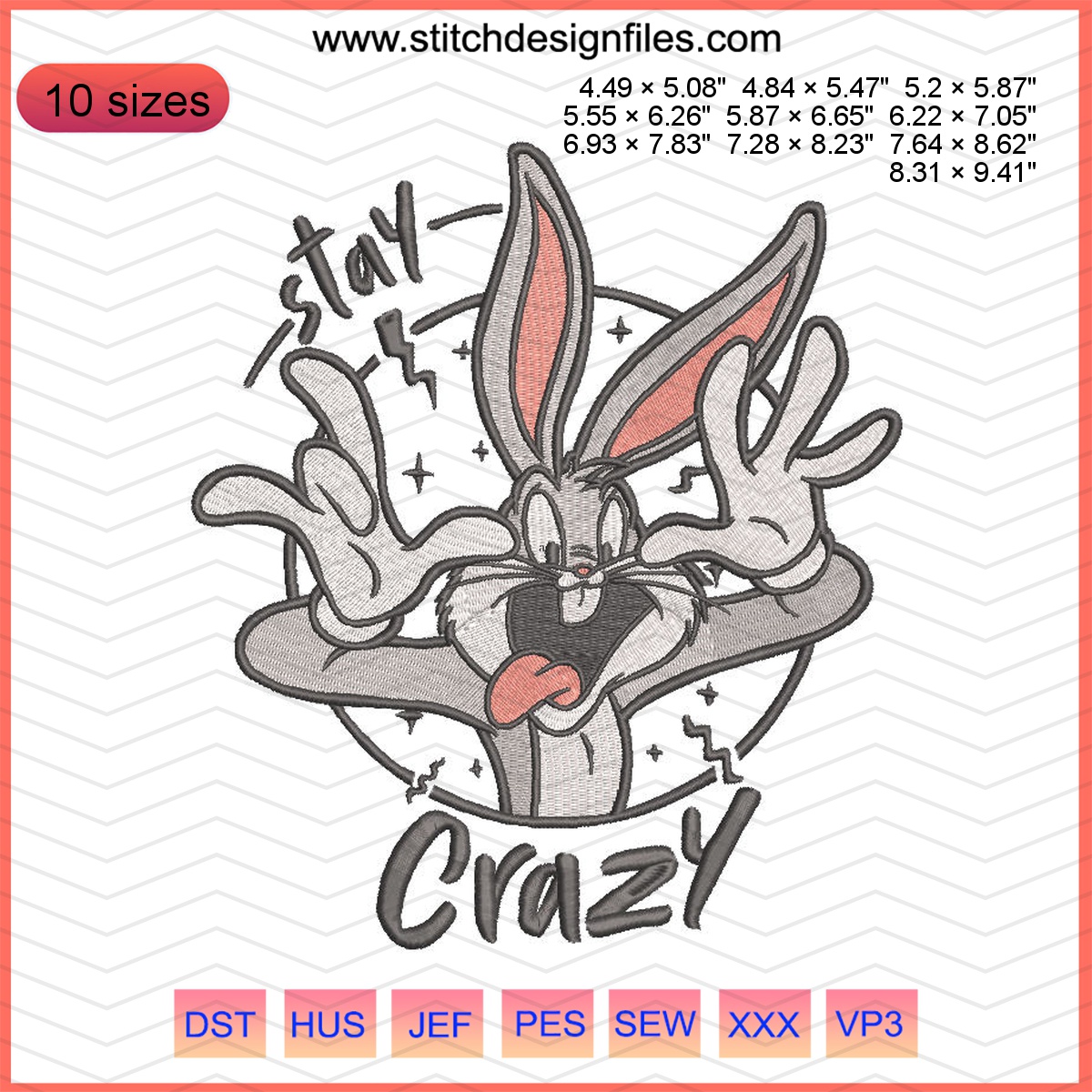 Unleash your creativity with our vibrant Bugs Bunny Stay Crazy embroidery design, an ideal choice for fans of classic cartoons. This delightful design captures Bugs Bunny’s whimsical spirit, making it perfect for anyone looking to add a playful touch to their fabric projects.