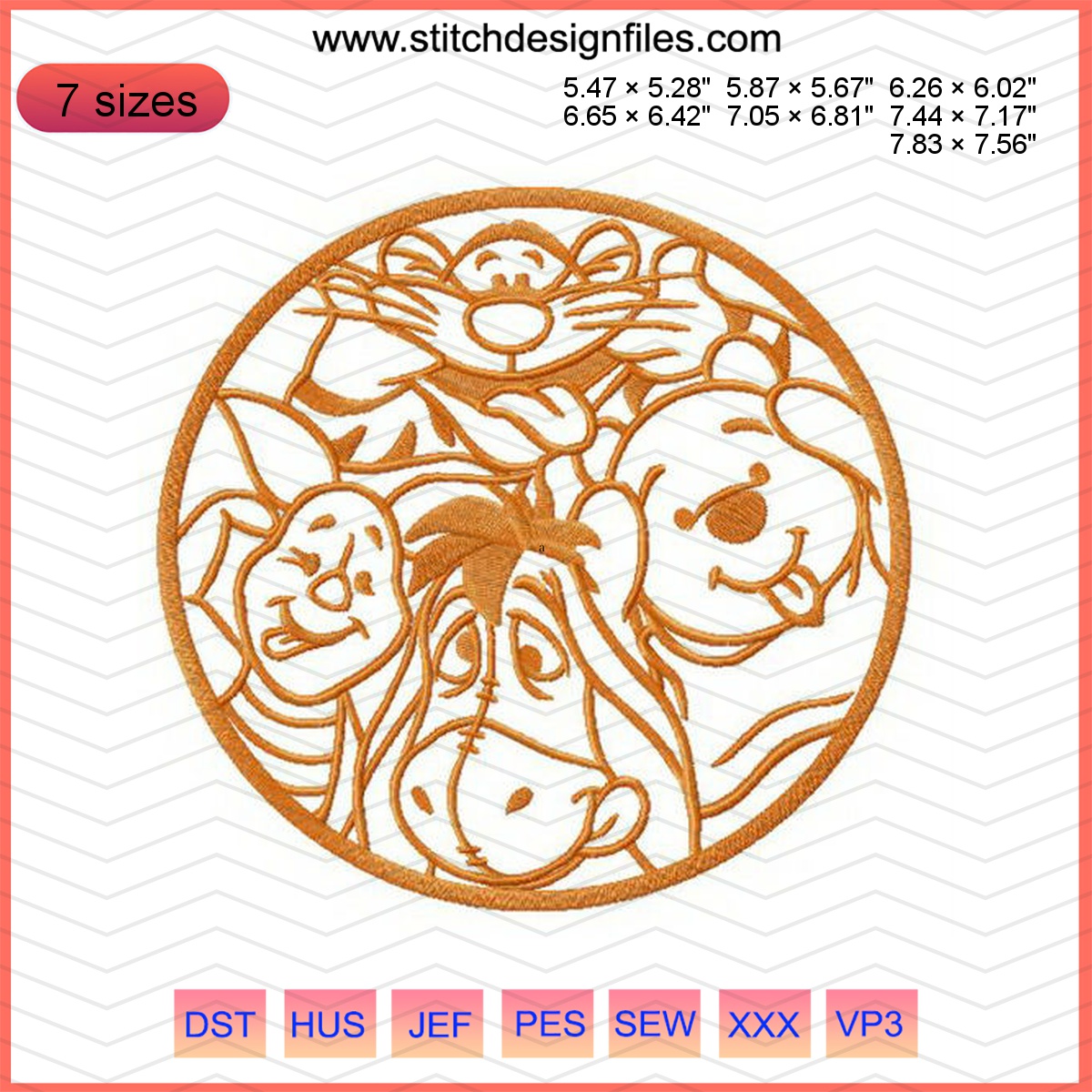This enchanting embroidery design features beloved characters including Winnie the Pooh, Piglet, Eeyore, and Tigger, symbolizing joy and friendship. Perfect for a variety of projects, this design brings the magic of the Hundred Acre Wood to life!