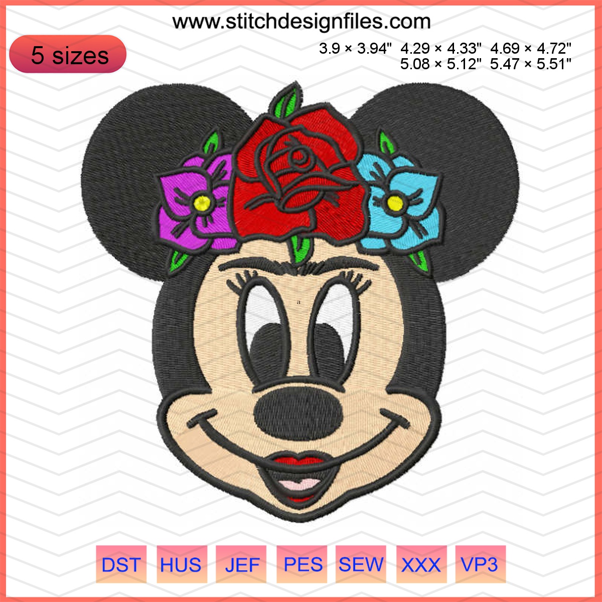 The Minnie Frida design is compatible with various embroidery machines and comes in a range of formats: