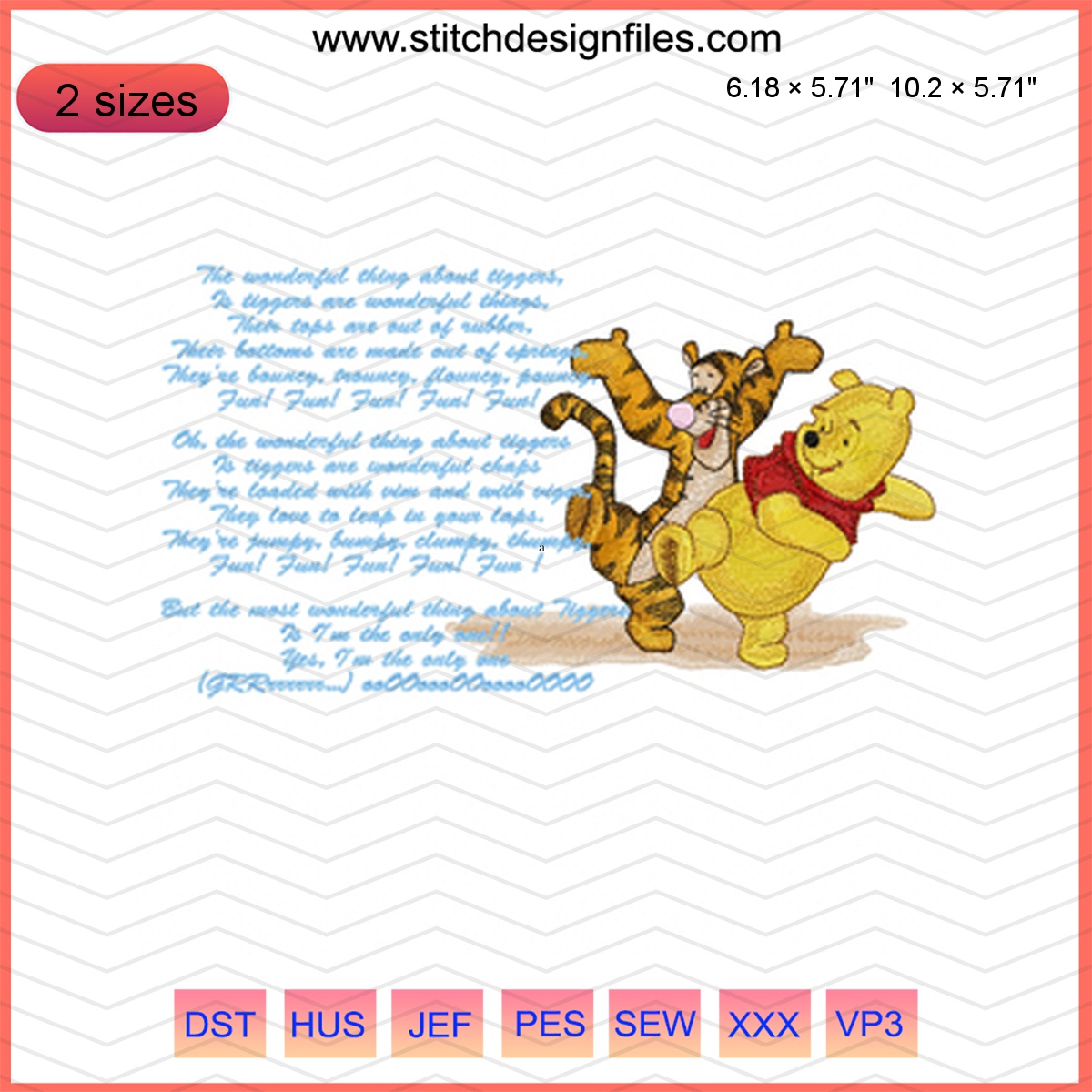 Capture the joy of childhood with this delightful embroidery design featuring Winnie the Pooh and Tigger singing together.